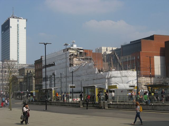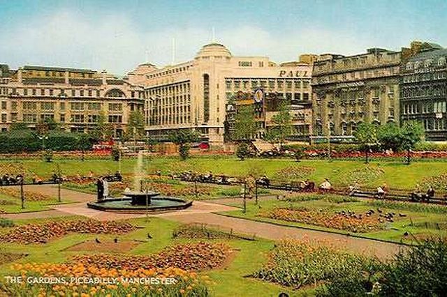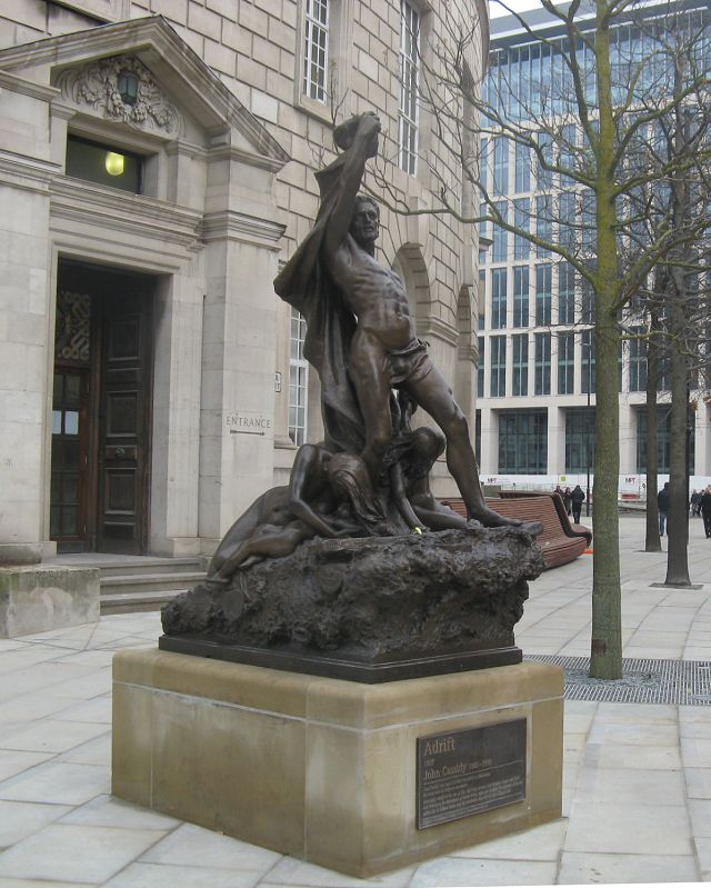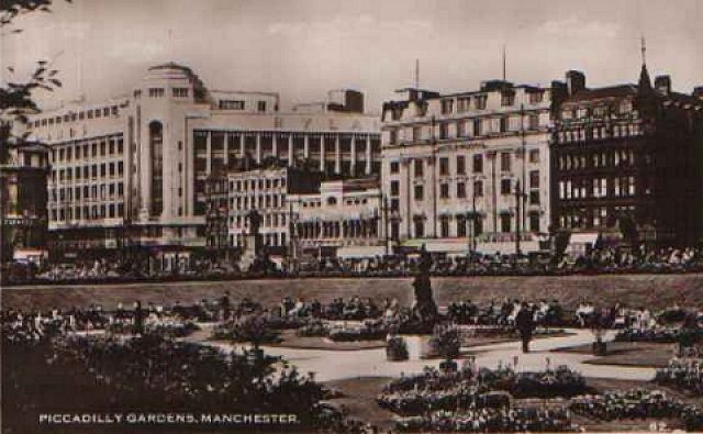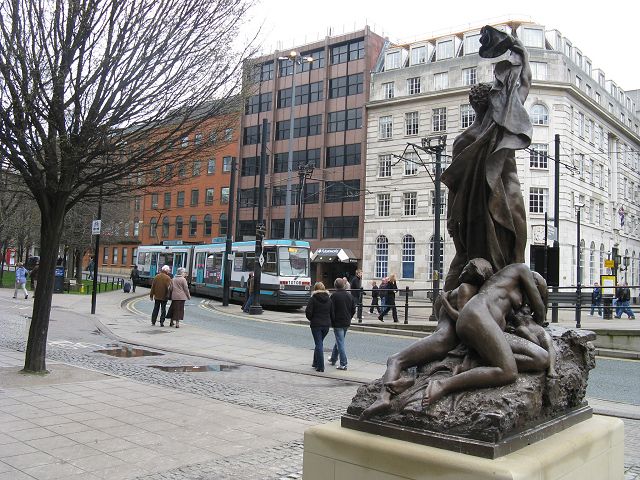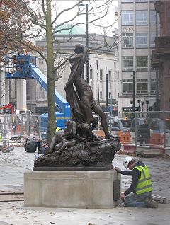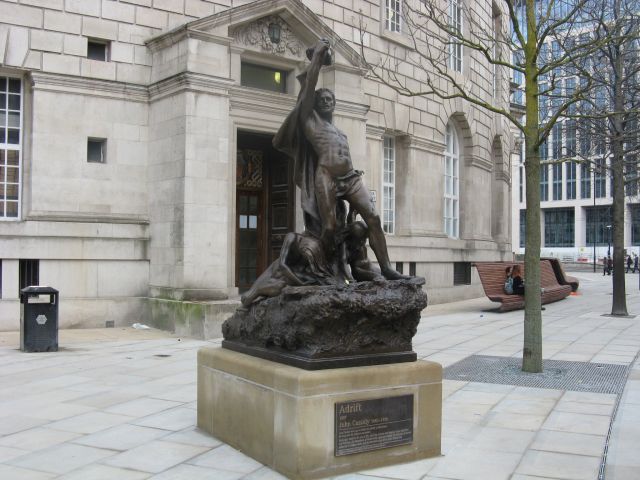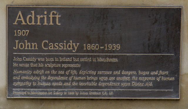 Signed 'John Cassidy fecit 1907' it was exhibited at the New Gallery in London in that year. Rarely since his student days was Cassidy able to create anything other than portraits or memorials, and this is certainly his major work of 'pure' art. Showing the influence of the so-called 'New Sculpture' movement, on his thinking, the scene depicted is full of action. It was purchased by James Gresham, a wealthy local engineer who collected many works by living artists - perhaps it was also commissioned by him. Gresham offered it as a gift to the City Council with the intention that it would be displayed in the new municipal art gallery that was to be built on the site of the Royal Infirmary in Piccadilly, which was in process of relocating to a new site on Oxford Road. The donation had the proviso that 'my gift of this statuary to become absolute when a permanent home is found for it in your new gallery.' ![]() The new gallery never appeared, and City's Art Gallery remaining in Mosley Street, but the statue did come to grace the site, removed from the Gallery loaned to the Parks department after World War I, and becoming the centrepiece of the 'sunken garden' which was created there, as seen in the postcard view above. This garden, which gave its name 'Piccadilly Gardens' to the area, with its beautiful floral displays, and seats where weary shoppers could take their rest, was the pride of the City's gardens department and was enjoyed by many people over the years. ![]() This postcard view is later than the one above, probably dating from the the early 1950s. The Rylands & Sons warehouse, designed by Harry S. Fairhurst, and constructed from 1929 to 1932, looms over the far corner of the gardens. (Note the radio mast on the roof.) This building was one of the last of Manchester's great cotton warehouses to be built, and one of the few to use a 'modern' style rather than taking inspiration from the past. Rylands and Sons was the firm established by John Rylands, subject of another Cassidy sculpture. In the 1950s, it was converted to a department store for Paulden's, whose own store, near the Manchester School of Art, had been destroyed by fire. Today it is known as Debenhams - the company had taken over Paulden's business in 1928, but continued to trade in Manchester as Debenhams until about 1970. ![]() Manchester decided to commemorate the coronation of Queen Elizabeth in 1953 with a fountain, which was erected in the centre of the gardens in place of 'Adrift' - as seen in the postcard view above ... which causes waves of nostalgia to wash over the present writer. Wiles' toyshop on the corner across the road from Paulden's was the highlight of any visit to the city, perhaps preceded by lunch in Woolworth's self-service restaurant and a sit in the gardens until near the time for our hourly train home to depart from Piccadilly Gardens. ![]() 'Adrift' was relocated, on 21 April 1953, to the grassed ground-level area (in the foreground of the old picture) at the south end of the gardens, where it can be glimpsed towards the bottom left of the view above, against a backdrop of the futuristic buildings erected in the 1960s to replace those destroyed by enemy bombing at Christmas 1940. ![]() It was here that the above picture of 'Adrift' was taken in 1998 by Aidan O'Rourke, who we have to thank for allowing us to include it, and indeed for all the marvellous work he does in compiling a photographic record of the Manchester area, and encouraging discussion about our built environment. The gardens, and in particular the sunken area with its long benches (which, readers will note from the oldest picture on this page, were not originally present) became seen by the late 1990s as a haunt of so-called 'undesirables'. (Maintenance of flowerbeds no doubt cost money, too.) So in the wake of the 1996 bomb attack on the city centre, and in preparation for the 2002 Commonwealth Games in Manchester, it was decided to carry out improvements to the gardens. A competition was held to choose a new design for the area. The winners – announced in 1998 – were the landscape architects EDAW and their partners: the engineers Arup, Japanese architect Tadao Ando, local architects Chapman Robinson, and lighting engineer Peter Fink. Unfortunately, in order to fund this project, it was decided to allow the speculative building of a new and ugly office block, known as No.1 Piccadilly, on the level area at the south end, thus losing green space, a rare thing in the centre of Manchester. The 'improvements' to the sunken part of the gardens, completed in 2002, involved filling in the sunken area to normal ground level, and creating a large lawn with a geometrical arrangement of paths and water features (by EDAW), and new a long, low curved building (the 'pavilion') on the west side including some eating places, which presents a bare concrete surface reminiscent of the the Berlin Wall to people to passengers at the Metrolink tram station beyond. Not a flower in sight - except on days when a flower market is held nearby. And ... we still read reports of drug dealers and other problems. The Coronation Fountain of 1953 was rescued and placed in Platt Fields park - in Fallowfield, not far, as it happens, from John Cassidy's last home in Albion Road - with a rose garden planted around it, for the Queen's Golden Jubilee in 2002. 'Adrift' disappeared into Council storage, but after some years, and discussion about what to do with it, at the end of March 2009 it was back in public view, in a prominent location in St Peters Square (above). The original plinth of 1908 is said to have carried a plaque with the following inscription: HUMANITY ADRIFT ON THE SEA OF
