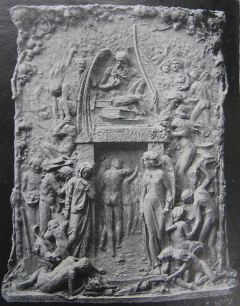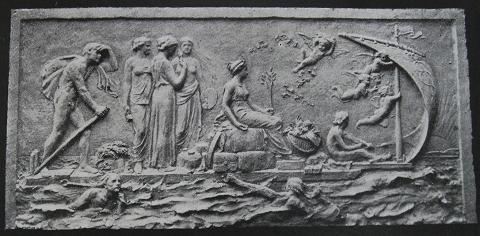 Above the portal Father Time sits throned on volumes of Mystic Lore, closed and clasped to all who have not passed the doorway. Round about it a multitude of figures symbolise the life of Man, its development and decline, and two symbolic trees frame the whole. On the right is the Fruitful Vine, figuring the exuberance of youth; on the left maturity and declining years, experience and reflection are symbolized by the Tree of Knowledge, the Apple. At the gateway lies a half-extinct torch, dropped by one of the figures that have left this world behind, and a winged being -- Youth -- borrows Light from it. The right side of the piece is filled with strong and slender forms, personifying Life, its Help, Affection, Love, Music and Labour. A Sower scatters seed, a Soldier is seen fighting, and so the figures mingle and merge into a vague crowd around and about the patriarchal figure of Time. Downward, on the left, it suggested Ripeness of Maturity, Wild Revel, Wretchedness, Despair. The Worn, the Burdened, the Blind, the Crushed are seen here, and the abandoned spade has fallen from enfeebled hands, whilst at the edge of the Gateway, leading a reluctant Child towards that "Goal of all Mortal," stands the figure, veiled and osseous, of Death, faced across the opening by the thoughtful form of the Recording Angel, scroll and pen in hand. As the figures enter the dark portal they let fall the Torch, the Purse, the now useless Earthly Crown. Veiling their downcast eyes with the hand, they enter slowly, but the foremost are seen to raise their arms with a growing of joyful Hope towards a bright Orb just visible, and no more, from the outward of the Gate. John Cassidy, Sculpt.