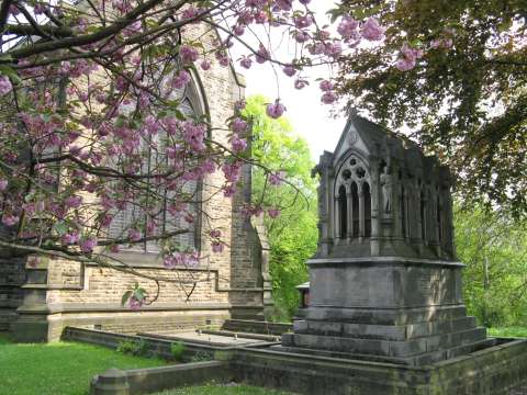RICHARD PEACOCK CE. MP. WHO DIED ON THE THIRD OF MARCH 1889. AGED 69 YEARS. THIS TABLET WAS ERECTED BY THE EMPLOYES [sic] OF GORTON FOUNDRY TO THE MEMORY OF THEIR LATE RESPECTED EMPLOYER WHO REPRESENTED THE GORTON DIVISION OF EAST LANCASHIRE IN PARLIAMENT FROM ITS FORMATION AS AN SEPARATE CONSTITUENCY UNTIL HIS DEATH. HE WAS A MAN OF STERLING QUALITIES, A KIND AND UNOSTENTATIOUS FRIEND TO THE POOR AND NEEDY, AND A GENEROUS SUPPORTER OF ALL AGENCIES FOR THE SOCIAL ELEVATION OF THE PEOPLE. ![]() The ChurchBoth Richard Peacock and his business partner Charles Beyer were church-goers, but of slightly different theological persuasion, and both decided to fund a new church for their community; in a spirit of friendly rivalry, the legend has it, they agreed that the first to be completed would have a peal of bells. Peacock's Unitarian Church, a replacement for the ancient Gorton Chapel, was the 'winner' and got its bells (inscribed with Mr Peacock's name) although it appears to have actually opened later than Beyer's Anglican church of St James. ![]() According to Robert Siddall, the church was given as a thanksgiving for the recovery of his daughter from a serious illness. The church, built in a field by the Gore Brook - hence the name Brookfield Church - was designed by Manchester architect Thomas Worthington, a prominent Manchester Unitarian, and opened in 1870. ![]() Richard Peacock is commemorated twice at 'his' church - three times if you view the church itself as a memorial. The plaque on the outside wall, facing the main road, was designed by Cassidy in a sentimental style featuring a mourning blacksmith (rather inappropriately dressed for his profession) with is hammer and anvil to symbolise the world of locomotive engineering, and an angel looking up to Peacock's new home in heaven. The bird forming the family crest is, you may think, the eponymous peacock, but in fact it is a cockatrice, 'a legendary creature, resembling a large rooster with a lizard-like tail' - chosen by Richard for his family crest. ![]() The inscription 'John Cassidy sculptor 1889' can be distinguished amid the corrosion at the bottom of the tablet. The tablet was paid for by a collection around the Beyer Peacock works, which in 1889 employed a total of 1735 men and boys, so it would not have been too difficult to raise the few pounds Cassidy would have asked for the design and modelling work. The actual casting was done in the Gorton Foundry itself, according to a history of the church written by its Minister, Rev. Cottier, in 1953. Craftsmen there would have been experts in brass and bronze casting, as there are many such parts in a locomotive. The mausoleumAs an eminent Victorian, a simple grave would not do justice to Richard Peacock: instead the extraordinary structure shown above was created to house his remains, and placed in a dominant position on the churchyard. Also designed by Thomas Worthington, it further commemorates his son Ralph (1838-1928) and his younger son Joseph, born in 1839, who had died before his father, in 1875. This old picture of the mauseoleum shows that it originally had railings around the plinth, and what look like bronze statues perched on the two gable ends of the roof as well as the stone figures on each corner. As far as we know, none of this work was by Cassidy.... A walk in Gorton![]() Although I live just a few miles from Gorton, I had never visited the place before until I travelled there in May 2008 to take the pictures for this feature. I was pleasantly surprised at how many rural features it retains, at least in the area around the church, despite being very close to the City of Manchester and bisected by a busy and wide road - alighting from a bus opposite the church, I had to walk a considerable distance to find a safe place to cross. The Lord Nelson pub (picture above) is said to br over 300 years old, and looks just like the inns found in villages out in the countryside. There's a heritage trail, nature exhibits, and a pleasant park. Strolling around the back lanes, one can approach the churchyard from the side away from the road. A odd feature is the number of gravestones, presumably from the graveyard of the old chapel, which seem to be scattered around amongst the undergrowth. Beyer Peacock locomotivesAlthough they built their last loco in 1966, it is believed that over 350 of their locomotives still exist, including the very last one, Class 25 diesel D7659, which was saved for preservation by music producer Pete Waterman. The majority of these, epecially those still in working order were built after Richard Peacock's death. One exception is Lancashire & Yorkshire Railway no. 957 (British Railways No. 52044) an 0-6-0 goods engine which works on the Keighley and Worth Valley heritage railway in Yorkshire, although this was not a Beyer Peacock design. The Isle of Man Railway ordered all its locomotives from Beyer Peacock, and several are still used, including No.4 Loch which was delivered in 1874. To find the oldest survivor one has to travel to Sweden where 2-4-0 mixed traffic steam locomotive Swedish State Railways (SJ) no 3, Prins August, built in 1856, and also 2-2-2 passenger steam locomotive SJ no 75, Göta, built in 1866, and preserved in thenational railway museum No. 3 was one of six locomotives resulting from an order gained from the Swedish Government Railway during a visit by Charles Beyer to Hamburg in 1855. The Dutch State Railways were also good customers, and purchases over 600 Beyer Peacock locomotives over the years, starting in 1863 with an order for eight. 2-4-0 no. 13 of 1865 is preserved in the Netherlands railway museum, Utrecht. Peacock travelled to Holland to supervise the test running of the first locos, and letter from him describing his experiences survives in the National Library of Wales, which has the archive of Henry Robertson, third partner in the founding of the Beyer Peacock firm. In Manchester, the Museum of Science and Industry h