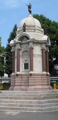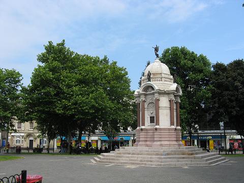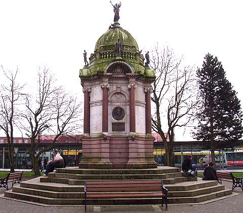 The John Kay memorial, Bury, Greater Manchester![]() We are pleased to report that the Kay memorial has been cleaned and refurbished in 2011, an operation which was very badly needed: we have updated this page with new pictures to celebrate the occasion. Arrive in Bury by bus or tram, visit the town's famous market or shopping centre, and you cannot fail to see the Kay Memorial, which is right in the centre of things, in the centre of Kay Gardens, an open space created from the former market place when a new market hall was built in 1901. The new space, and the memorial at its centre, erected in 1908, were paid for by Henry Whitehead, a wealthy local millowner (see lower left column). An imposing (over ten metres high) and complex structure, designed by Bristol-based architect, William Venn Gough (1842-1918), the memorial, constructed by local builders, Thompson and Brierley, comprises, in the words of the Public Monument and Sculpture Association National Recording Project (PMSA): Ornate Italianate domed