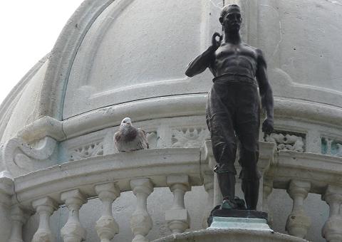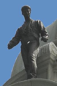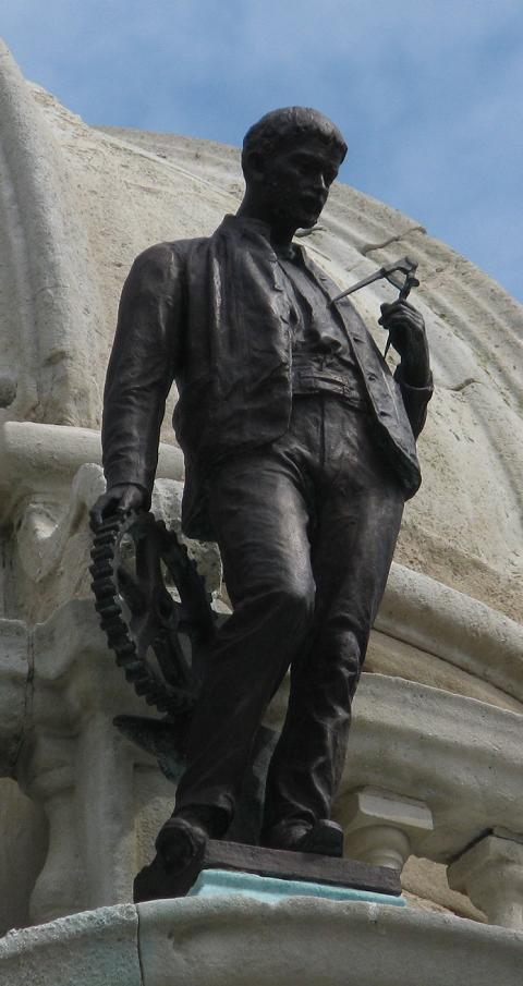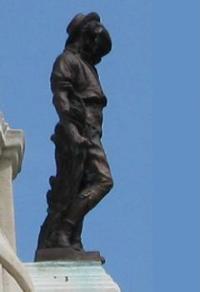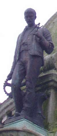 The bronze statues, medallion and plaques are all by John Cassidy. Fame, perched at the top of the dome, is shown blowing a long this trumpet and holding a laurel wreath. Of the four workers the original description was: 'Agriculture' is a young man with a sickle, mopping his brow; Engineering is a man with a cogwheel and a pair of compasses or dividers; Mining is a bare-chested man with a pickaxe and safety lamp; and Weaving is the main in a cap holding a shuttle.' Our pictures show that the pickaxe, the safety lamp and the sickle are all missing: they would have been separate parts from the main castings, and may well have been stolen, or possibly removed in case they fell on the people who congregate around the memorial. Sadly, perhaps, they have not been replicated during the refurbishment. ![]() Above 'Mining.' A bronze copy of this statue was retained by Cassidy and appears as 'The Miner' in his 'Catalogue of a Small Collection' of 1914. The picture reproduced there shows how this one would have looked originally. 'Agriculture' is perobably also the same figure as listed in that catalogue as 'The Reaper.' ![]() 'Engineering' (above) has emerged particularly well from cleaning: he still has his original gearwheel and dividers. ![]() 'Fame' has the look of a cousin of 'victory' seen on Cassidy's later war memorial work. Kay Gardens and the Kay Monument were opened in April 1908. Mrs Henry Whitehead opened the gardens and the Earl of Derby unveiled the monument. ![]() THE GIFT OF HENRY