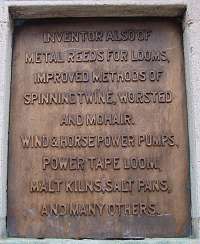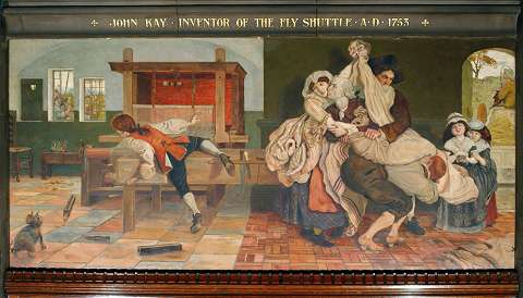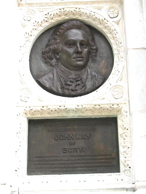 Unfortunately his inventions were pirated in France too, but by all accounts he made a reasonable living. He died in the south of France during the winter of 1780–81. The exact date and place remain unknown, as does the site of his grave; at the time France and England were at war. Although he left Bury, he has always been seen as a celebrated son of the town and one of the men responsible for Lancashire's success in the cotton industry, although he left before the development of the cotton industry and powered looms. Legends have developed around him, including the idea that he was driven out of Bury by hostile weavers who believed his inventions threated their livelihoods, and 'died in exile and poverty' as the working on the memorial has it. The legend is fostered by being included in Ford Madox Brown's series of murals in Manchester Town Hall chronicling Manchester's history. ![]() The official description of this work (above) from the Manchester City Council website reads: 'For thousands of years, weaving was done by hand, throwing the shuttle across the loom. If a wider cloth was needed, two weavers threw the shuttle to each other. John Kay invented a shuttle fired by a cord into boxes either side of the loom. On the left, rioters are breaking in to smash the loom, while Kay is being smuggled to safety.' ![]() The memorial in 2008, before cleaning. Links and ReferencesDouglas Farnie: 'John Kay' - entry in the Oxford Dictionary of National Biography. William Brockbank: The Honorary Medical Staff of the Manchester Royal Infirmary 1830-1948. Manchester University Press, 1965. (Available on Google Books) Tracy, W. Burnett and Pike, W.T: Manchester and Salford at the Close of the 19th Century: Contemporary Biographies. Brighton: W.T. Pike & Co., 1899. (Available on the Spinning the Web website) Robert Whitehead (1823 - 1905) - Wykenet ''[Walter] Whitehead's operations': British Journal of Surgery, Volume 12, Issue 48 p. 625-629. The Kays of Bury district, Lancashire: a Rootsweb genealogy compiled by Stephen Painter. Robert Whitehead: a brief history The Cottontown Project: Blackburn with Darwen Council Text and Pictures by Charlie Hulme, May 2009.