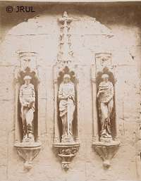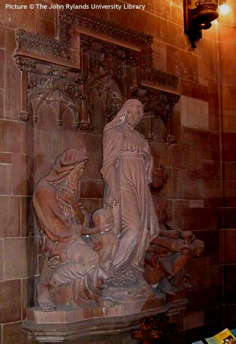 Cassidy (1860 - 1939). The John Rylands Library took nearly ten years to build, starting in 1890 and opening to readers in 1900. For more about the Library, see our Enriqueta Rylands page. ![]() Note: Unfortunately, since the opening in 2007 of the Library's new entrance wing to the side of the original building, this work is no longer seen by many visitors, as it is necessary to walk to the far end of the Reading Room, or to the far end of the exhibition corridor, and descend Champneys' main staircase to reach the original main entrance vestibule. The detour is well worth the effort, however, to see the impressive architecture of this area as well as Cassidy's sculpture. On the brighter side, however, the view of the sculpture is no longer obstructed by a display of publications for sale. ![]() A working sketch, from the Library archives. ![]() This photograph shows a model made by Cassidy early in the project, and rejected by Mrs Rylands. She disliked the niches, and wrote that 'the present appearance of three statues in a line all one height and size looks to me anything but striking and too much like the statues one sees in a cathedral.' Having no aesthetic use for this photograph, she used it to stiffen a bundle of book lists thus accidentally ensuring its survival, although badly faded and torn. Links and references: The John Rylands Library, visitor and general information Enriqueta Augustina Rylands (John Rylands Library) Basil Champneys (John Rylands Library) Douglas A. Farnie: "Enriqueta Augustina Rylands, 1843–1908, Founder of the John Rylands Library". Bulletin of the John Rylands University Library of Manchester Vol.71,no. 2: 3–38. (1989). Full text available online. "Rylands , Enriqueta Augustina (1843–1908)", Oxford Dictionary of National Biography, Oxford University Press, online edition, Oct 2006 (subscription required) |