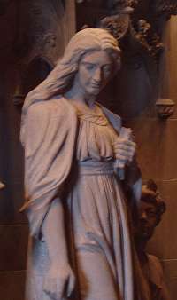 Theology Directing the Labours of Science and ArtThe John Rylands Library, Manchester![]() Cassidy's group Theology Inspiring Science and Art dominates the original main staircase of the John Rylands Library, although the similarity between its stone and that of the wall of the building creates a somewhat spectral effect, especially in a photograph. This is the story of the work, from the Library's publication John Rylands of Manchester by Douglas Farnie: In the foyer a group of statues,